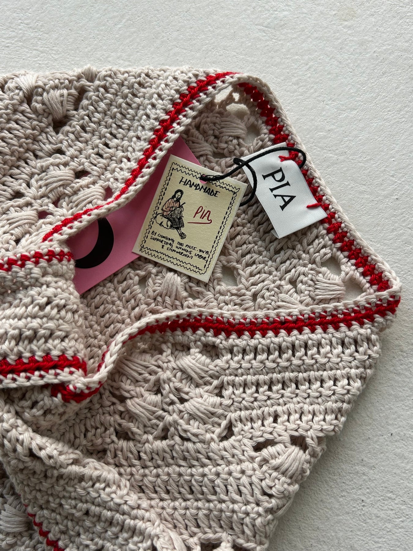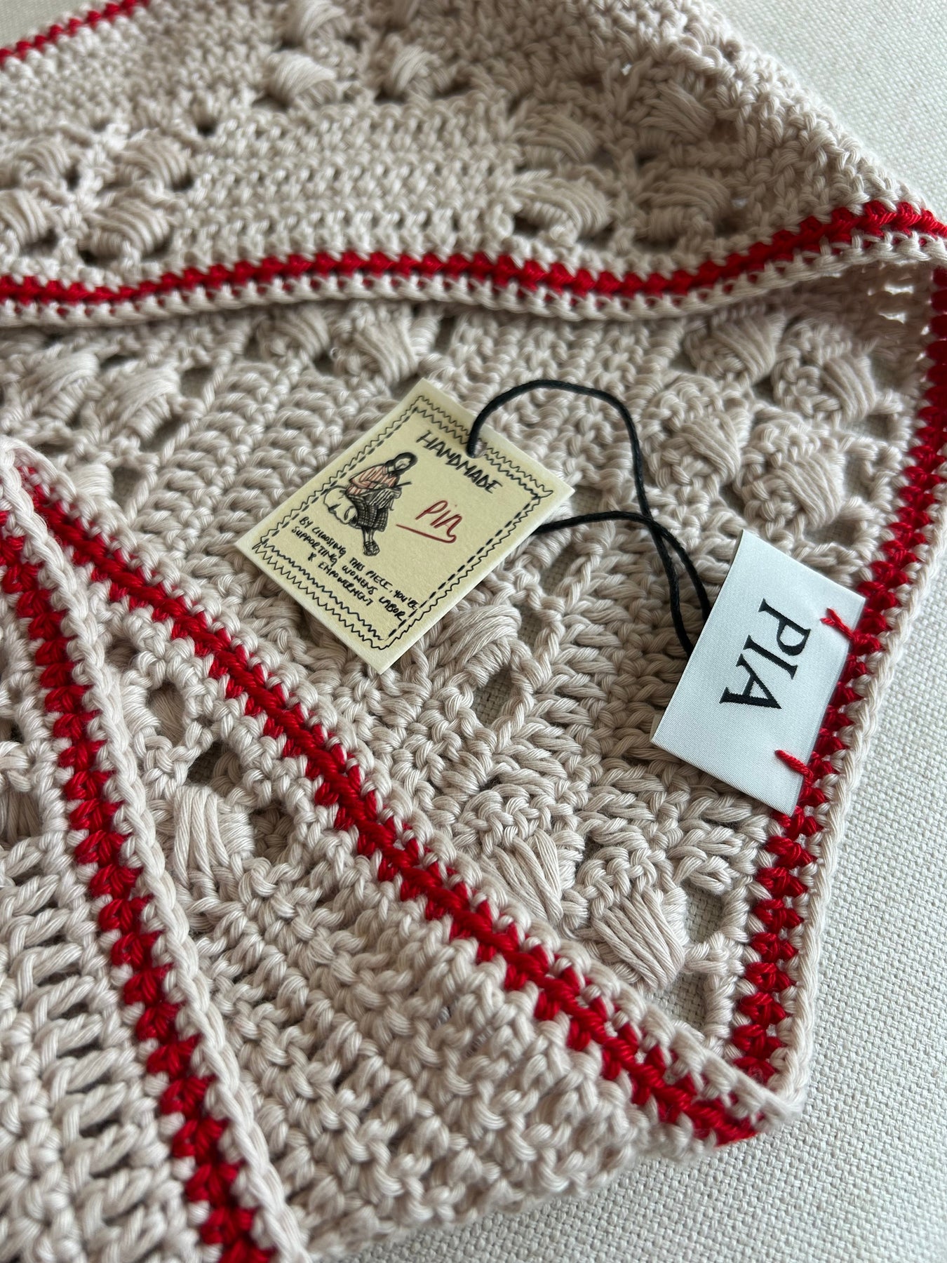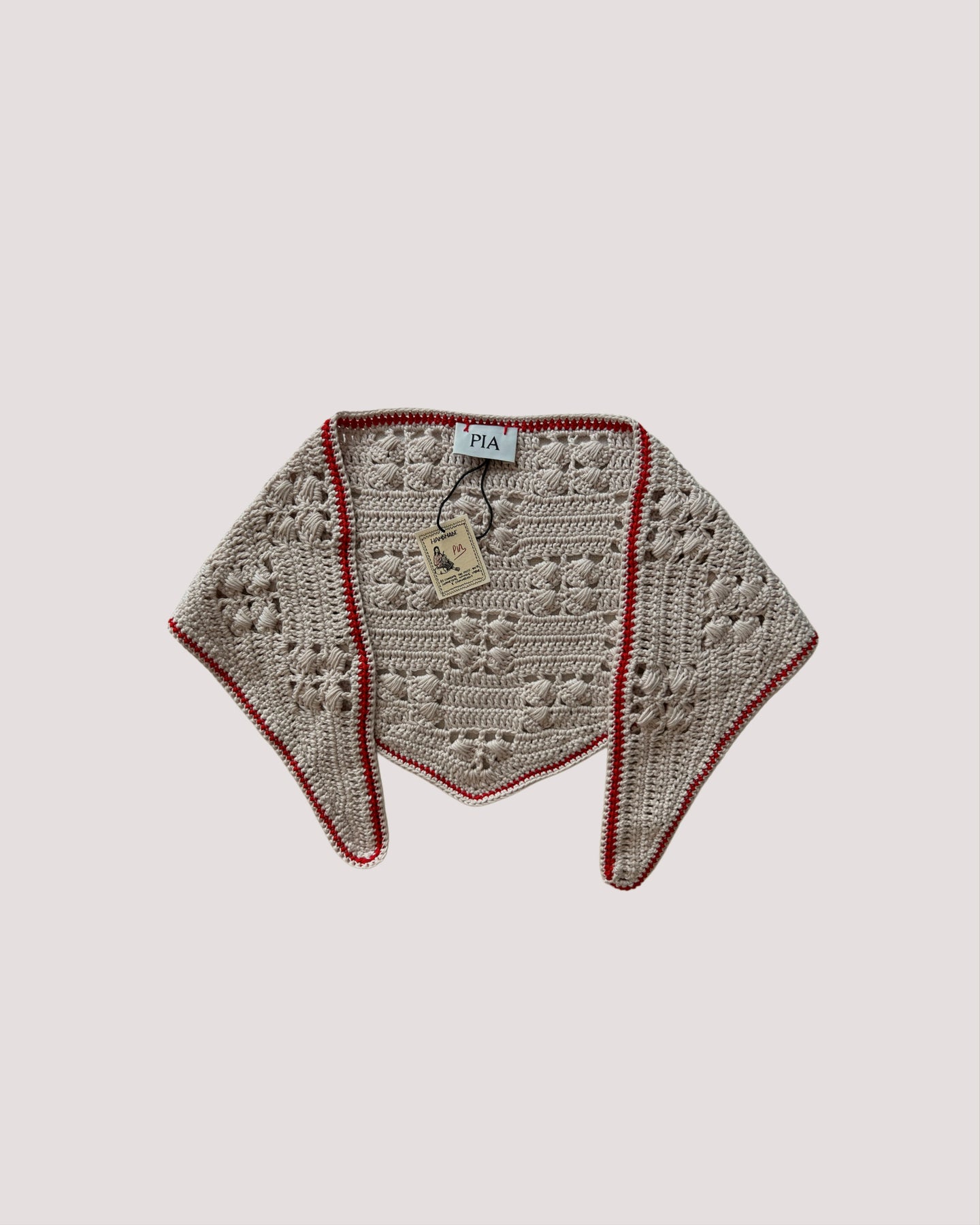 Crafted with delicate hand-knitted detailing, this unique scarf features a refined texture framed by a contrasting border. Its sculpted shape allows for versatile styling around the neck, adding a light yet sophisticated touch to any look.