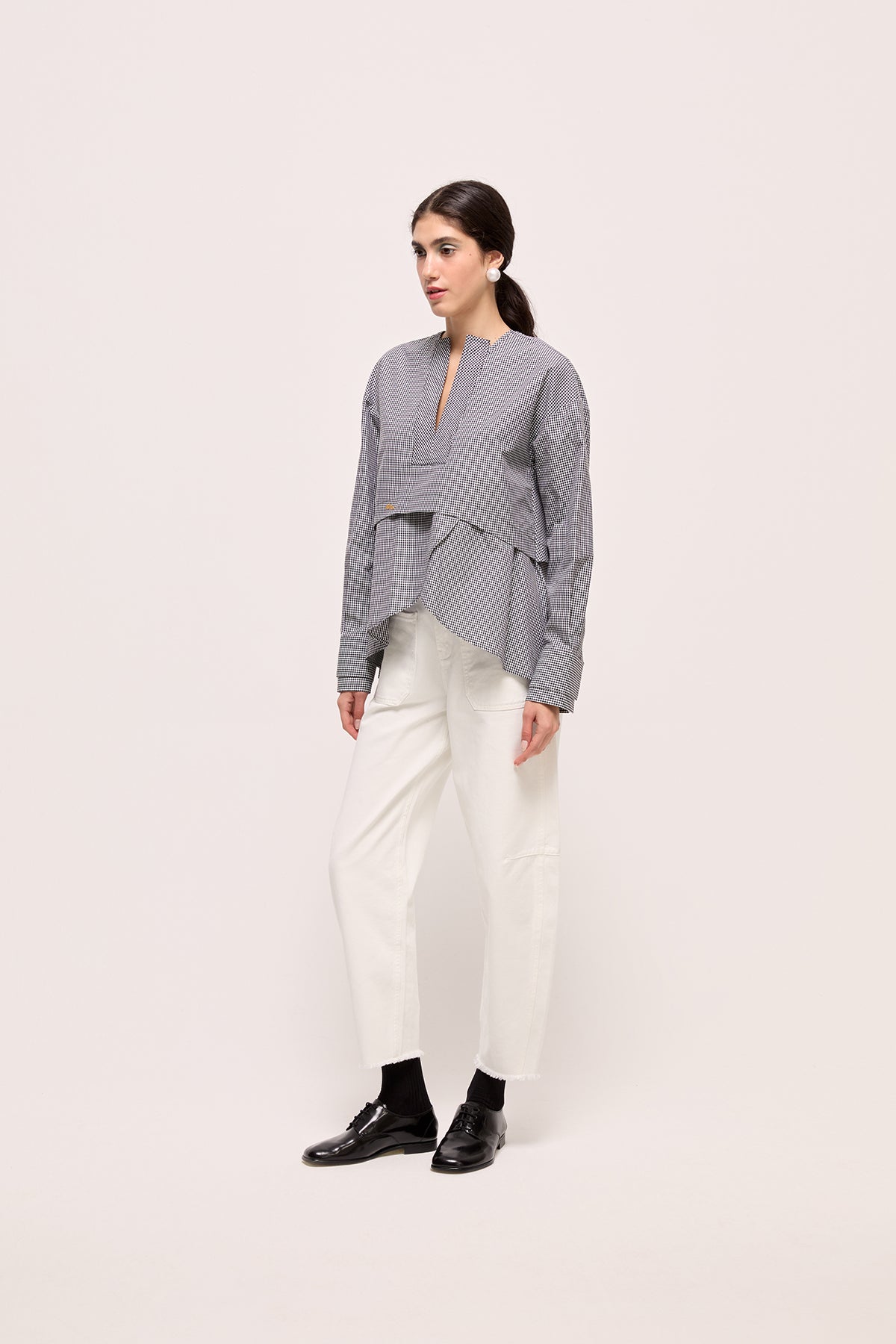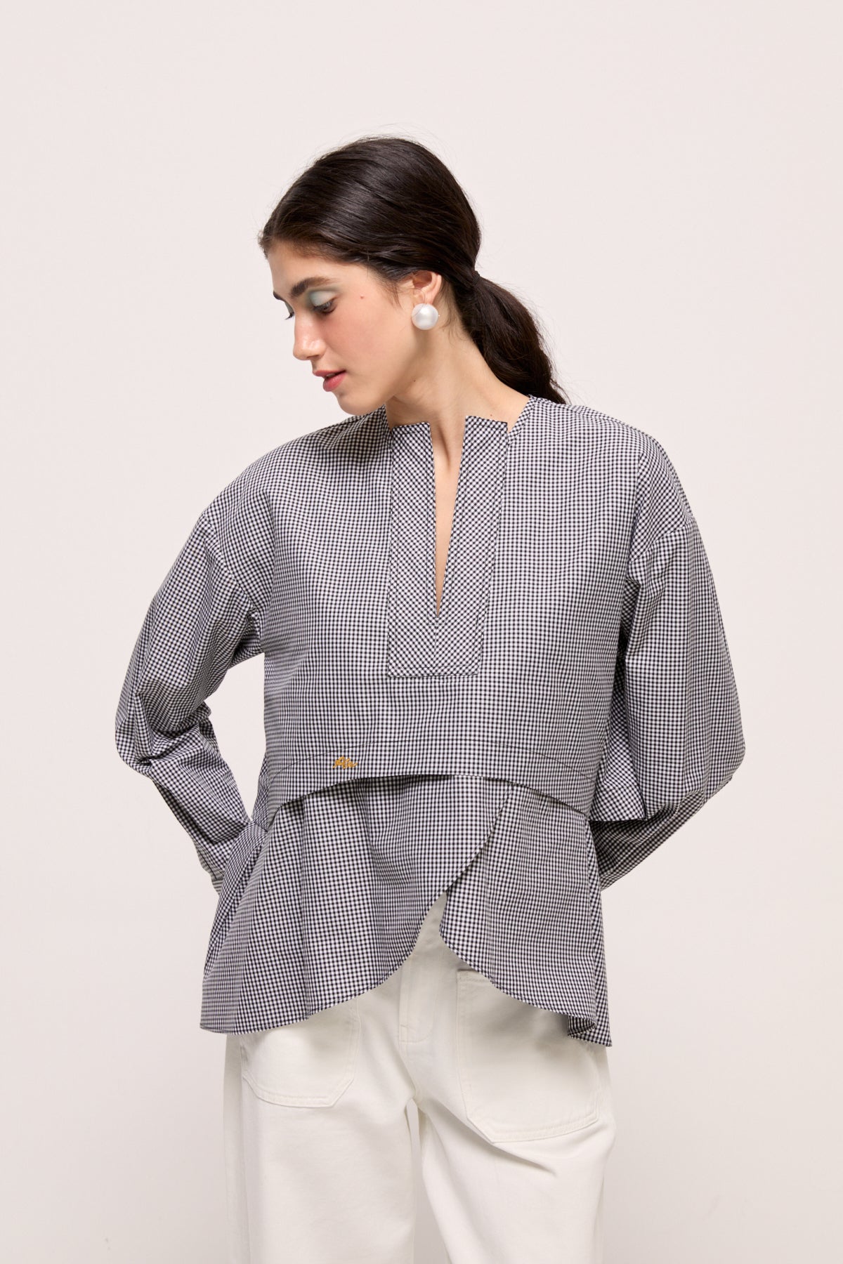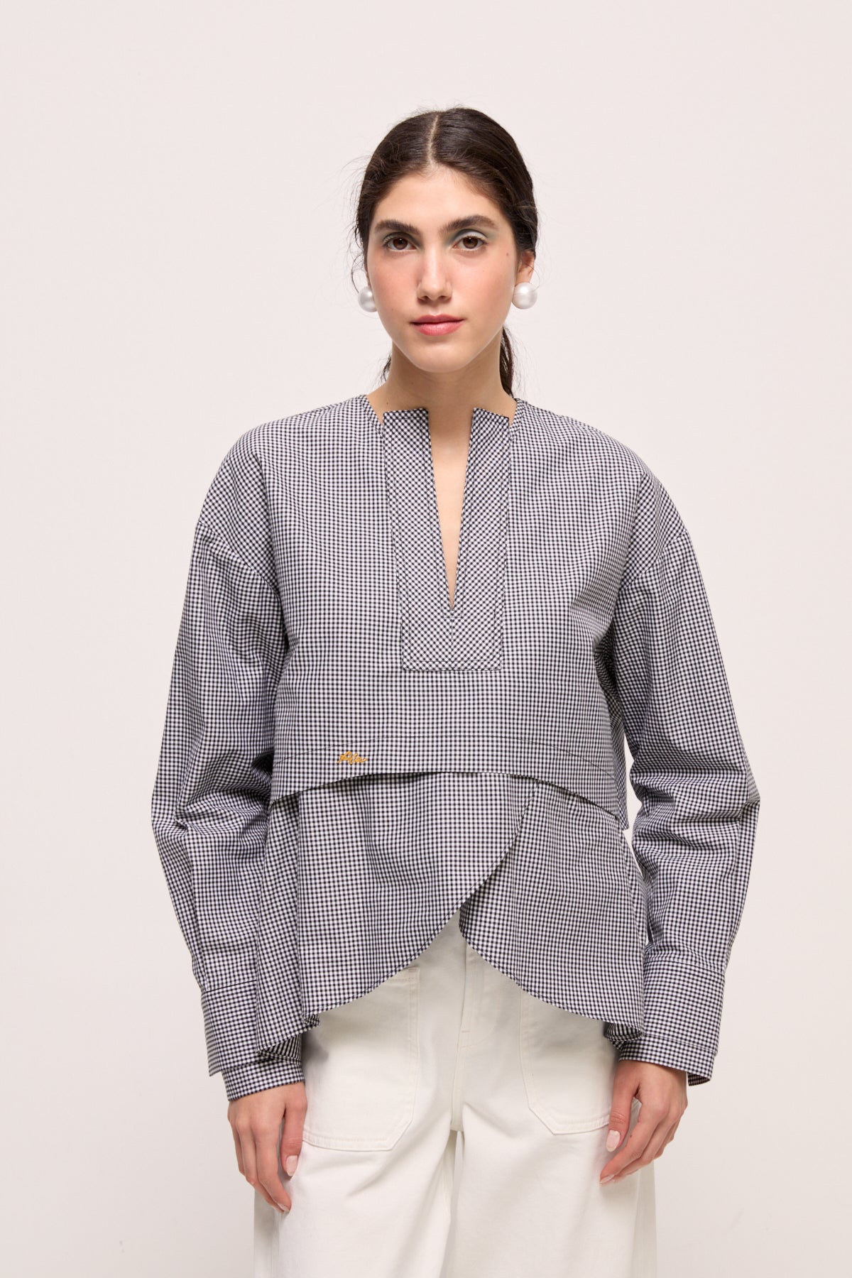 A black and white small gingham, loose-fitting shirt. Designed with a collarless neckline and a front V-slit detail for a modern look. Its asymmetric, layered cut adds a relaxed yet striking silhouette. Finished with elegant Pia embroidery on the front.