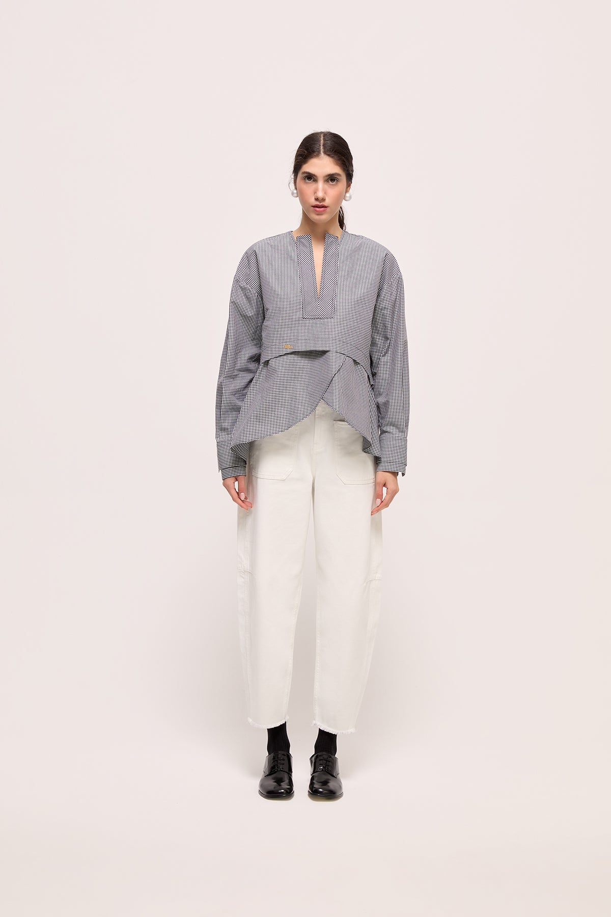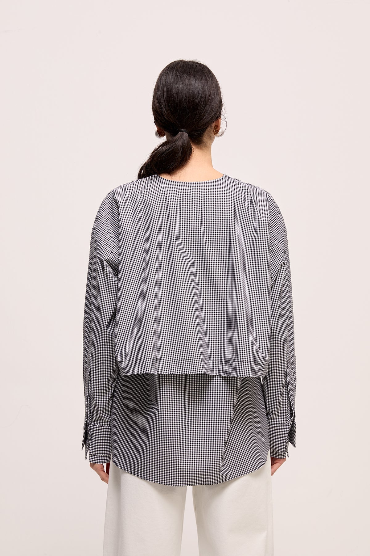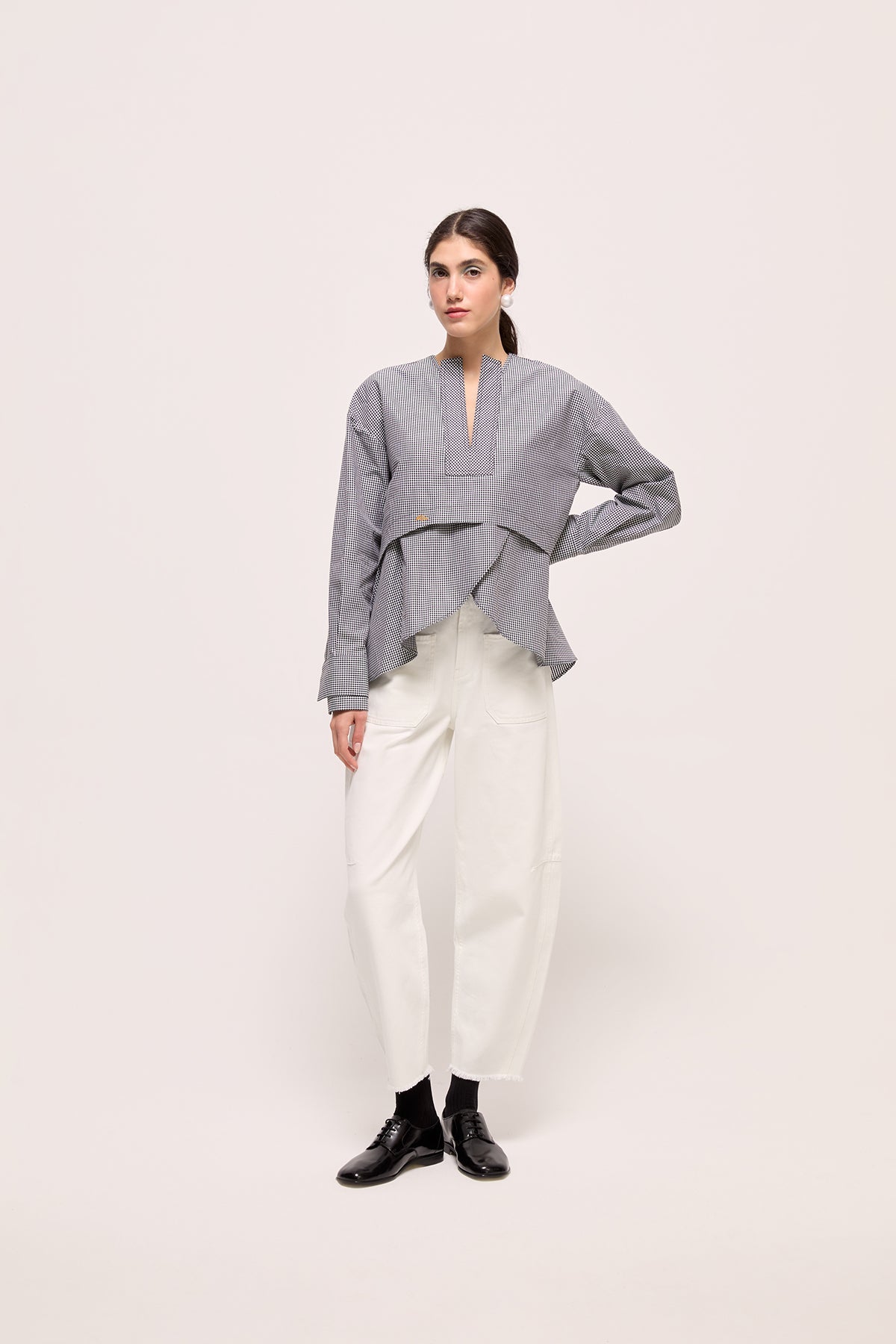 A black and white small gingham, loose-fitting shirt. Designed with a collarless neckline and a front V-slit detail for a modern look. Its asymmetric, layered cut adds a relaxed yet striking silhouette. Finished with elegant Pia embroidery on the front.