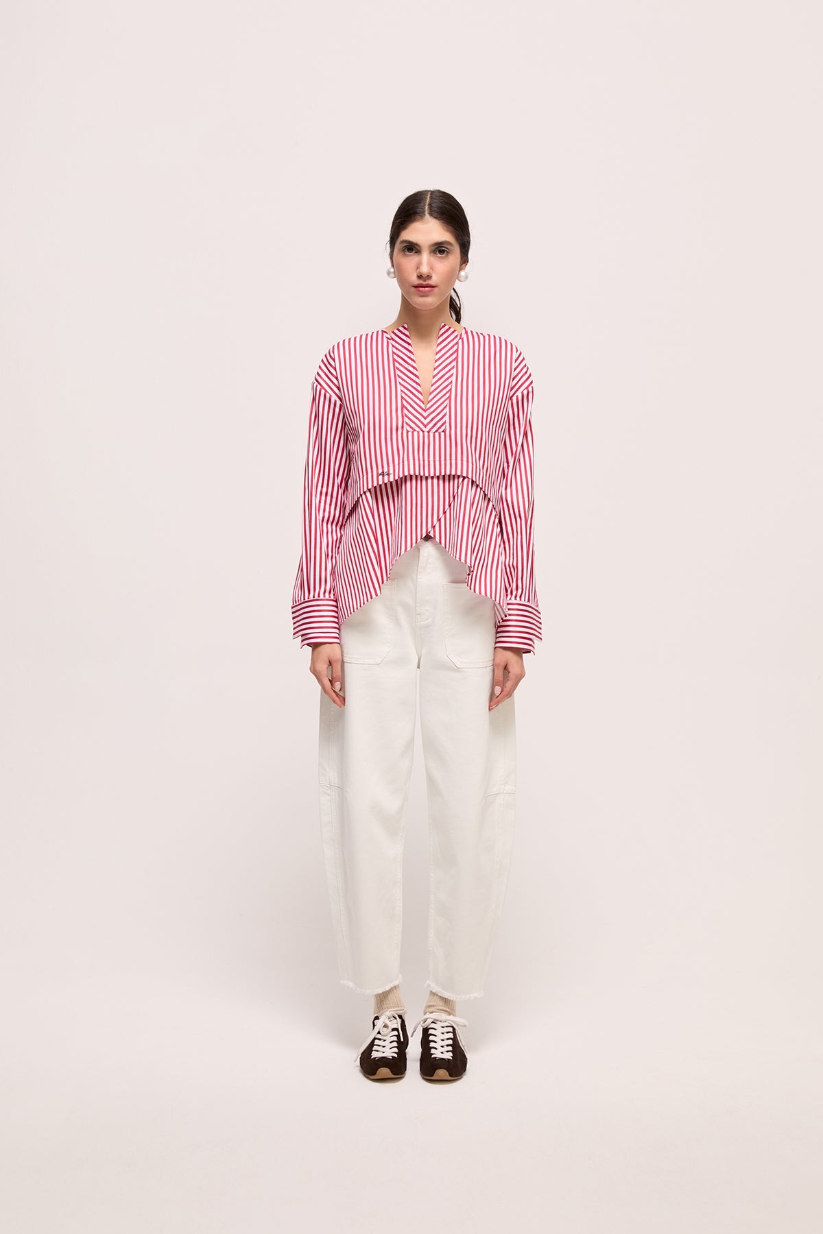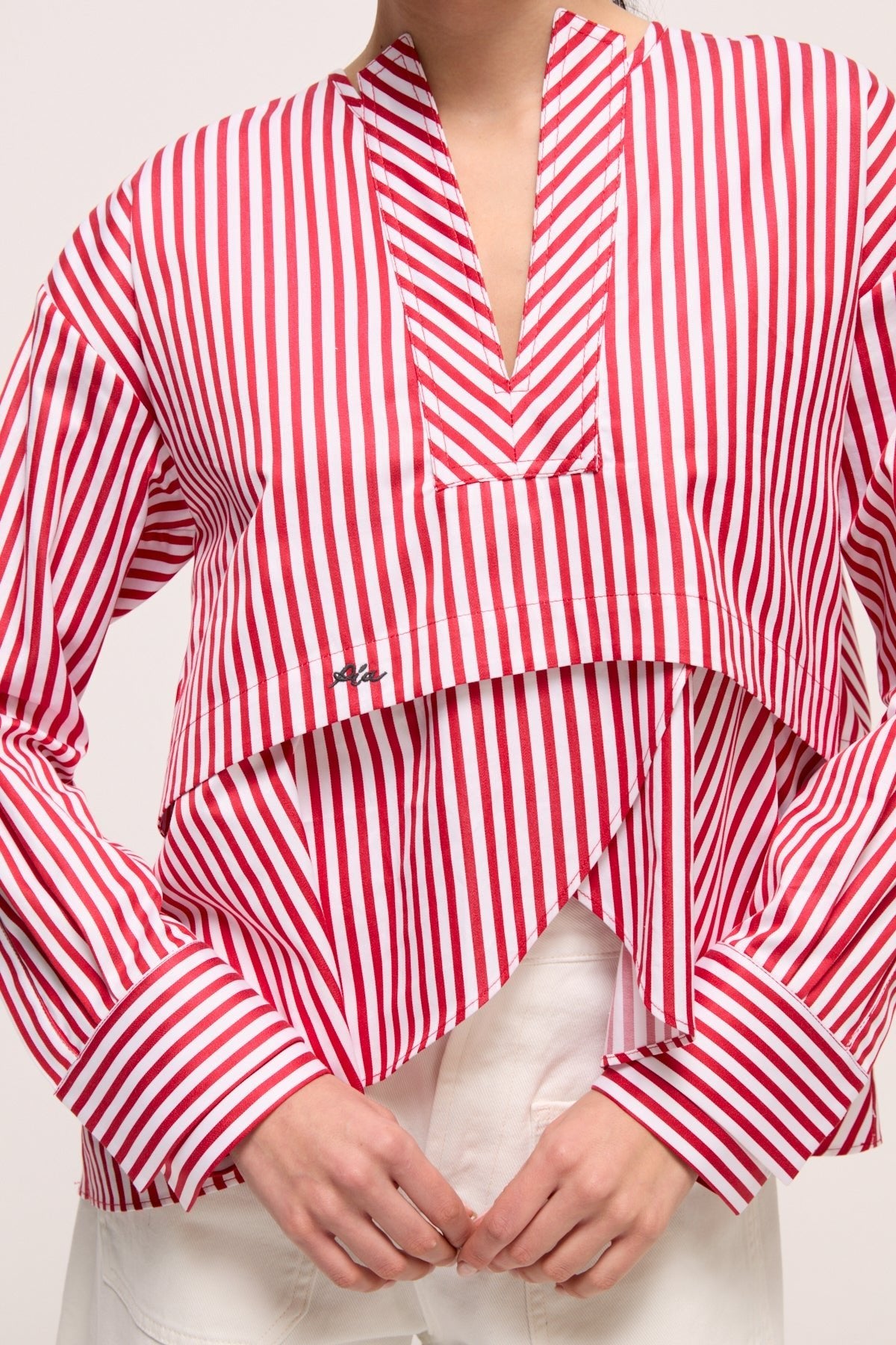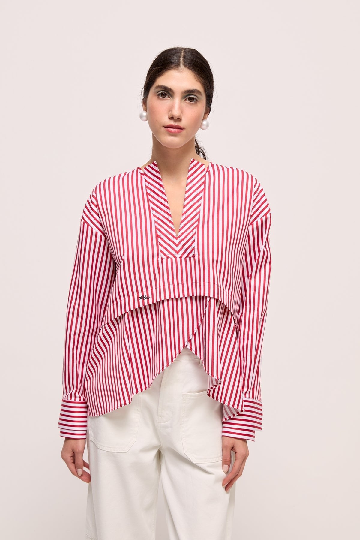 A red and white stripe, loose-fitting shirt. Designed with a collarless neckline and a front V-slit detail for a modern look. Its asymmetric, layered cut adds a relaxed yet striking silhouette. Finished with elegant Pia embroidery on the front.